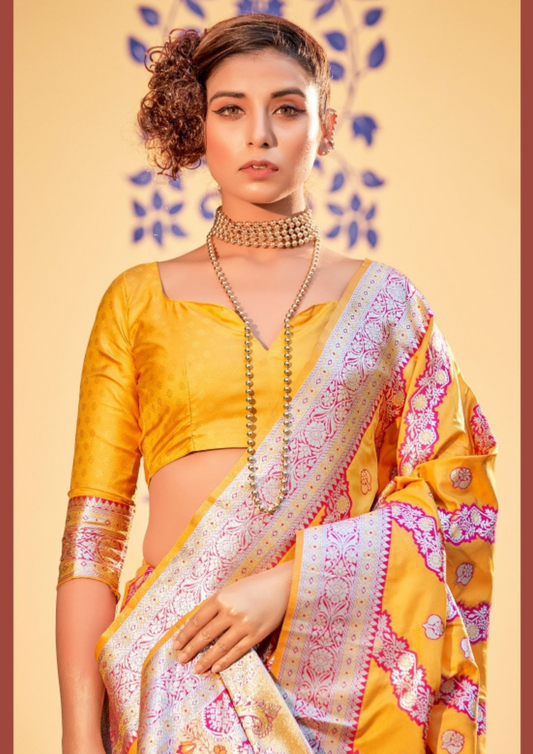 Elegant Yellow Colored Banarasi Soft Silk Saree With Zari Work For Women