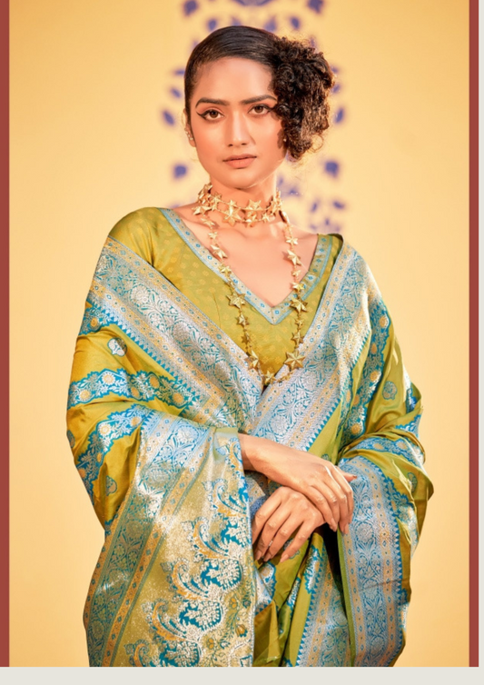 Pretty Olive Green Colored Banarasi Soft Silk Saree For Women