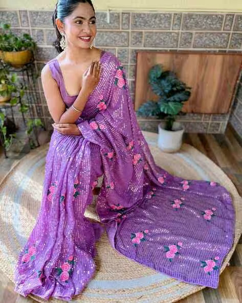 Charming Lavender Color Georgette And Sequins With Thread Work Saree For Women