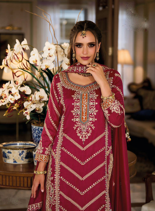 Dazzling Pink Color Premium Silk And Embroidery Work Palazzo Suits With Dupatta For Women