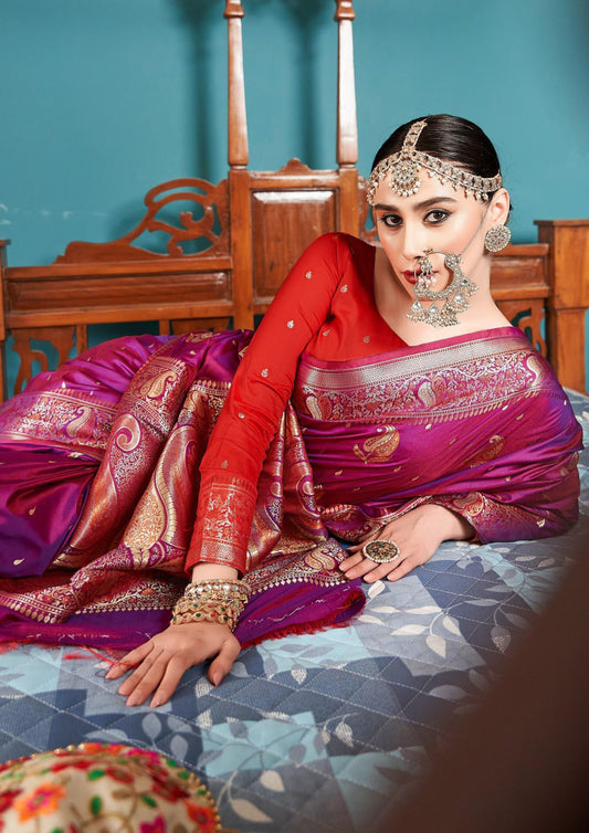 Attractive Purple Color Copper Weaving Soft Silk Saree For Women