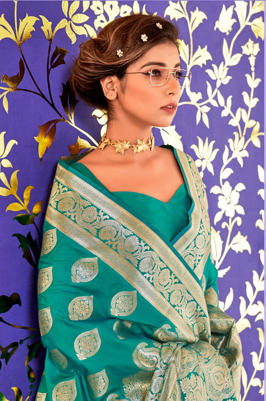 Gorgeous Teal Green Colored Banarasi Soft Silk Sarees For Women