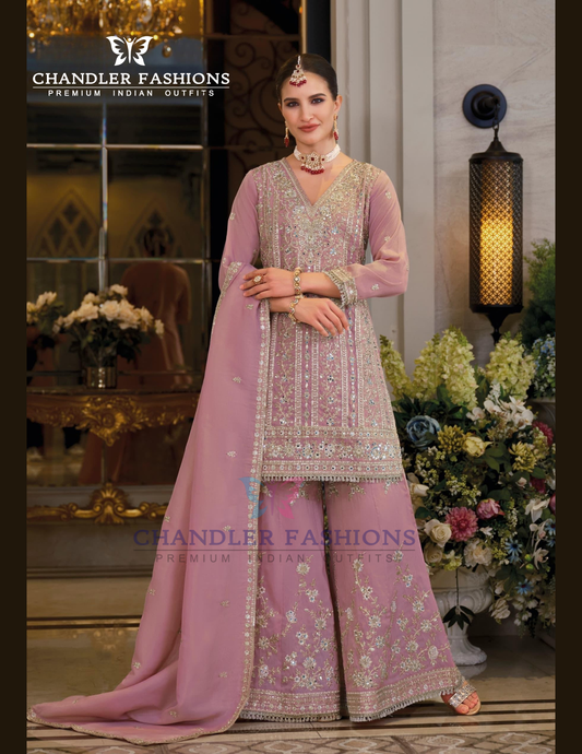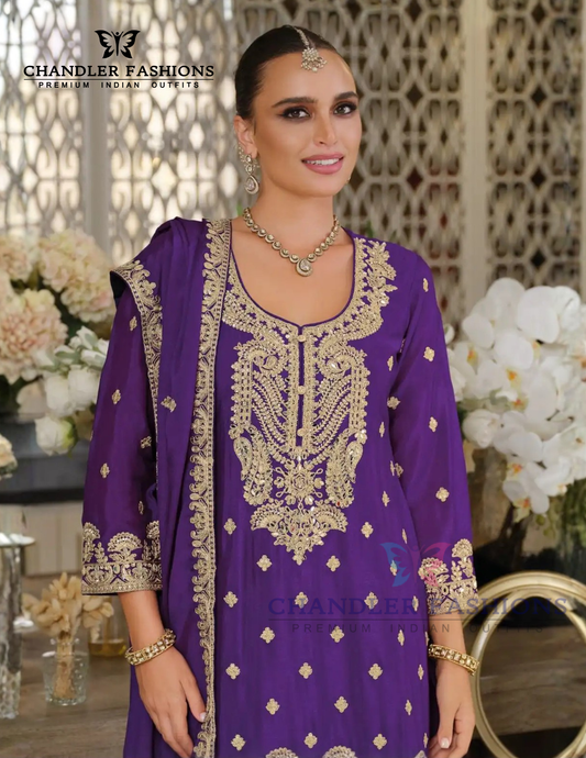 Beautiful Violet Color Chinon Silk With Embroidery Work Palazzo Suits For Women