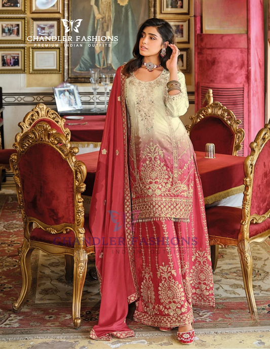 Elegant Red Color Chinon With Digital Print And Embroidery Work Palazzo Suits For Women