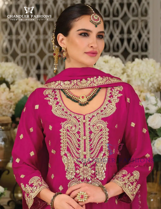 Charming Rani Pink Color Chinon Silk With Embroidery Work Palazzo Suits For Women