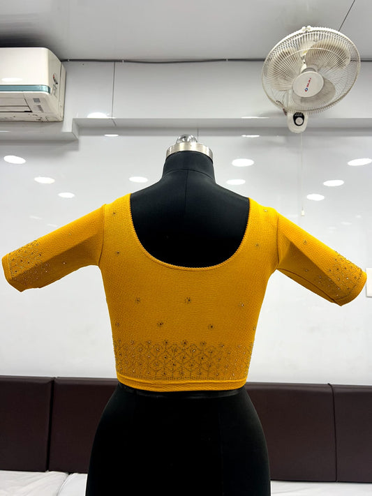 Appealing Yellow Color Cotton Lycra Ready To Wear Strachable Blouse With Siroski Work