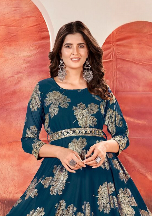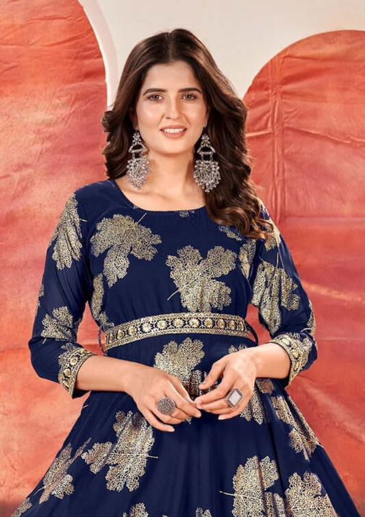 Attractive Blue Color Faux Georgette Foil Gold Print With Sequins Embroidery Kurti