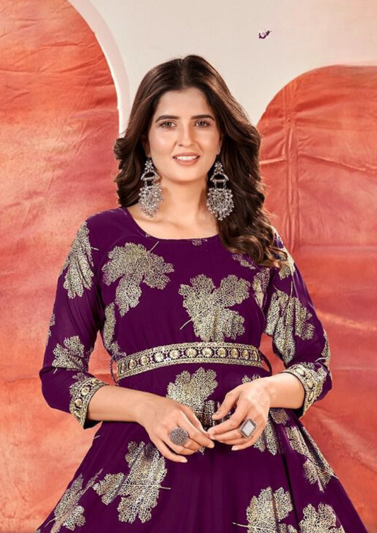 Attractive Purple Color Faux Georgette Foil Gold Print With Sequins Embroidery Kurti