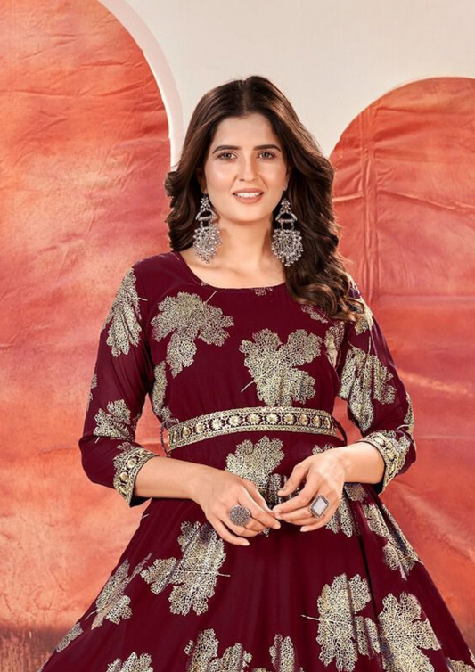 Alluring Maroon Color Leaf Design Sequins Embroidery With Faux Georgette Kurti