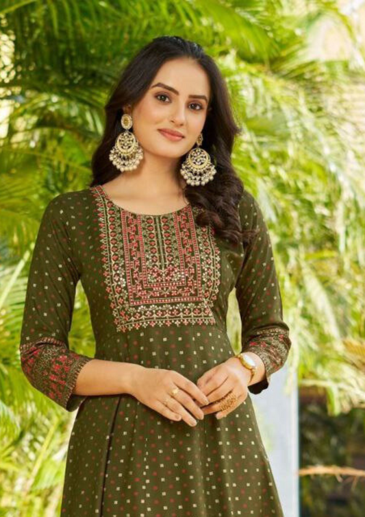 Beautiful Mehendi Green Color Rayon Foil Print Anarkali Gown With Embroidery Work
