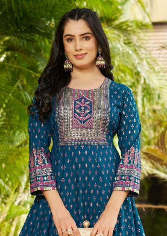 Elegant Designer Blue Color Rayon Foil Print Anarkali Gown With Embroidery Work