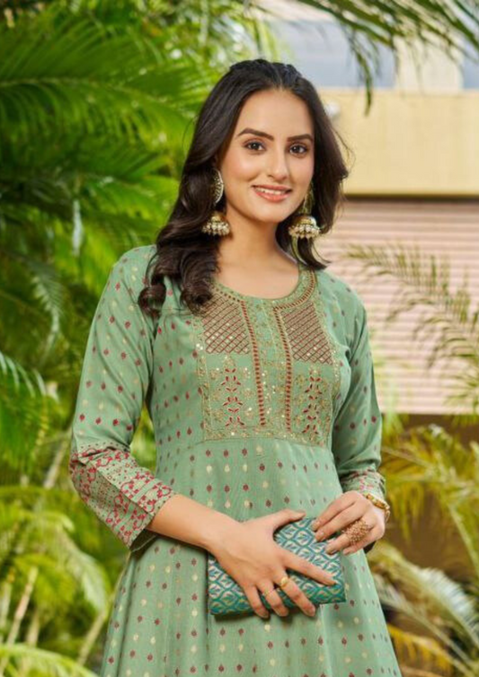 Attractive Light Green Color Rayon Foil Print Anarkali Gown With Embroidery Work