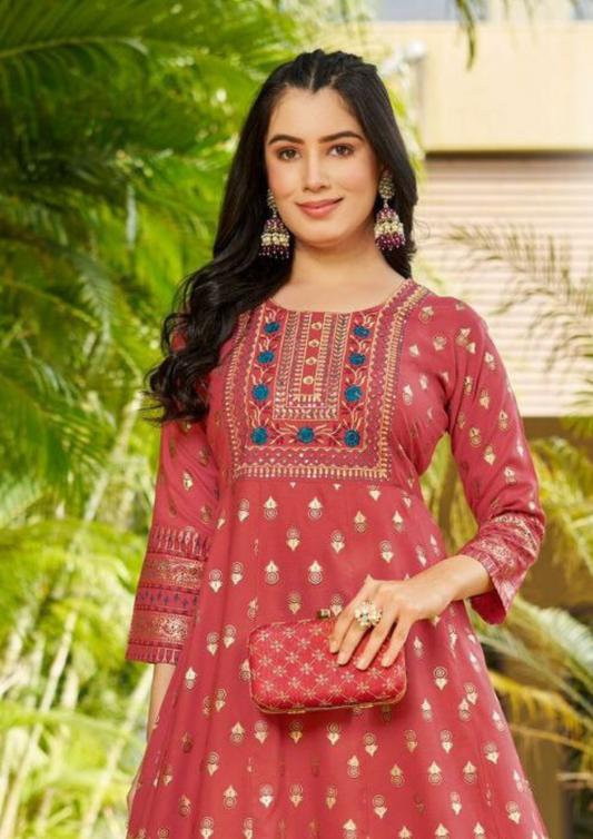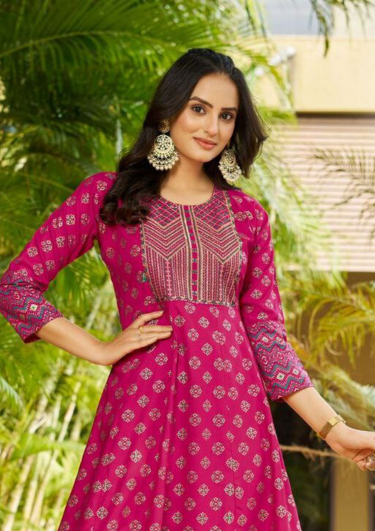 Gorgeous Pink Color Rayon Foil Print Anarkali Gown With Embroidery Work
