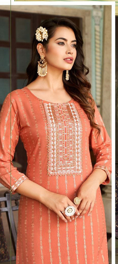 Gorgeous Peach Color Straight Kurti With Pant And Fancy Jacquard Dupatta For Women