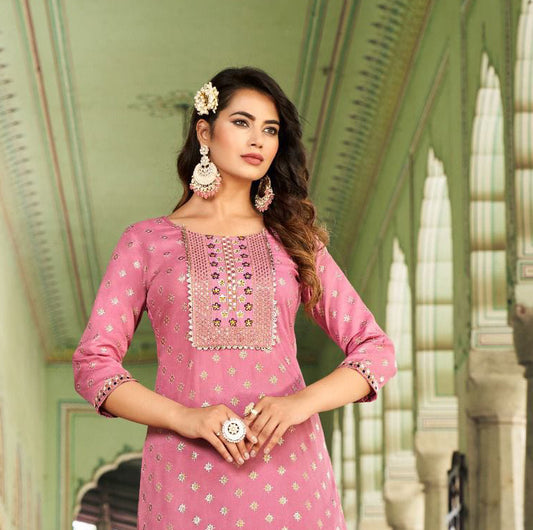 Elegant Light Pink Color Classy Rayon Foil Print With Embroidery Work Kurti For Women