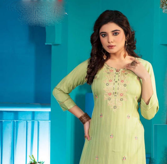 Alluring Light Green Colored A - Line Kurti With Computer Dori Sequence Embroidery Work For Women