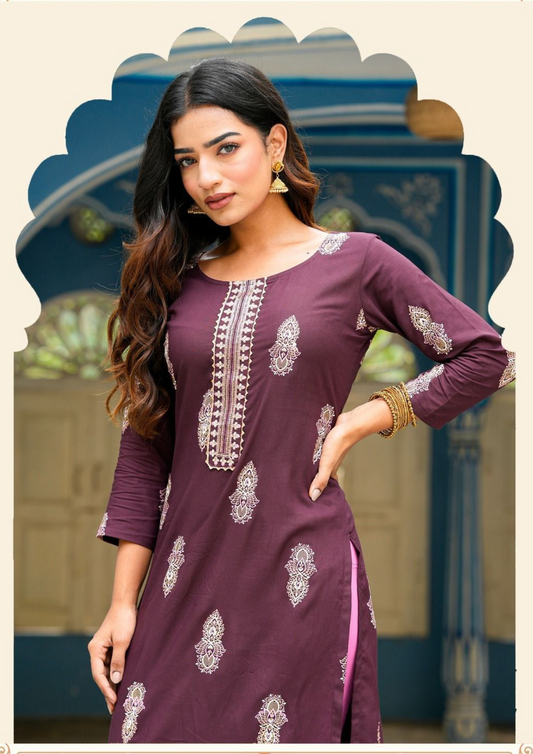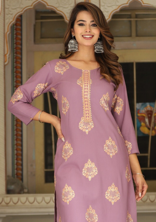 Stunning Purple Color Leaf Design Rayon Gold Print Kurti For Women