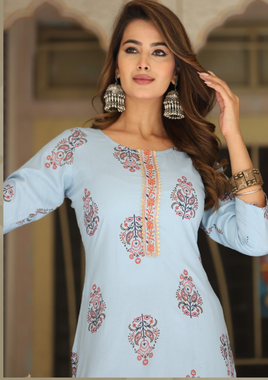 Appealing Blue Color Rayon Gold Print With Embroidery Work Kurti For Women