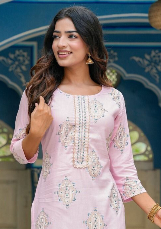 Pretty Pink Color Gold Print Rayon Kurti With Embroidery Work
