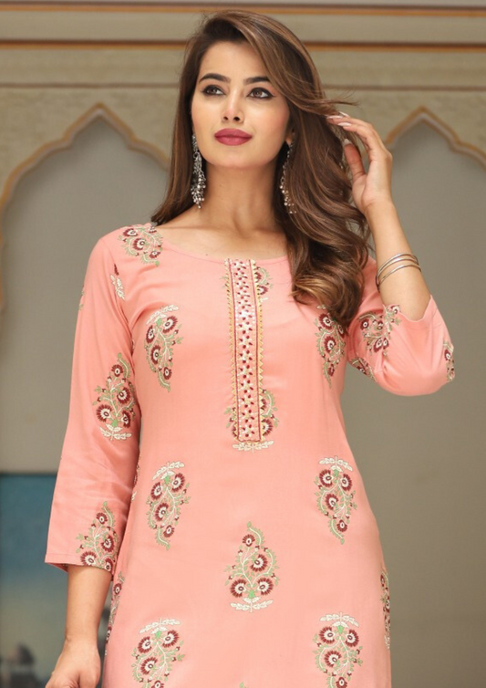 Beautiful Light Pink Colored Fancy Embroidery Work With Rayon Kurti