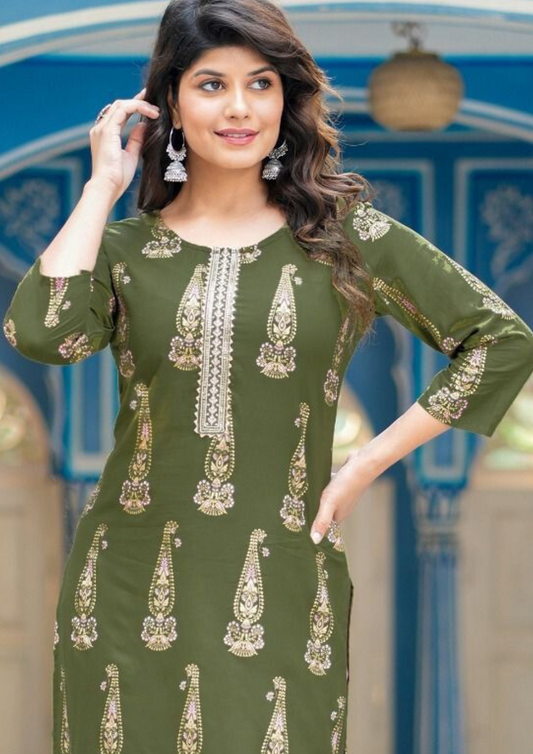 Gorgeous Green Color Rayon Kurti With Fancy Embroidery Work