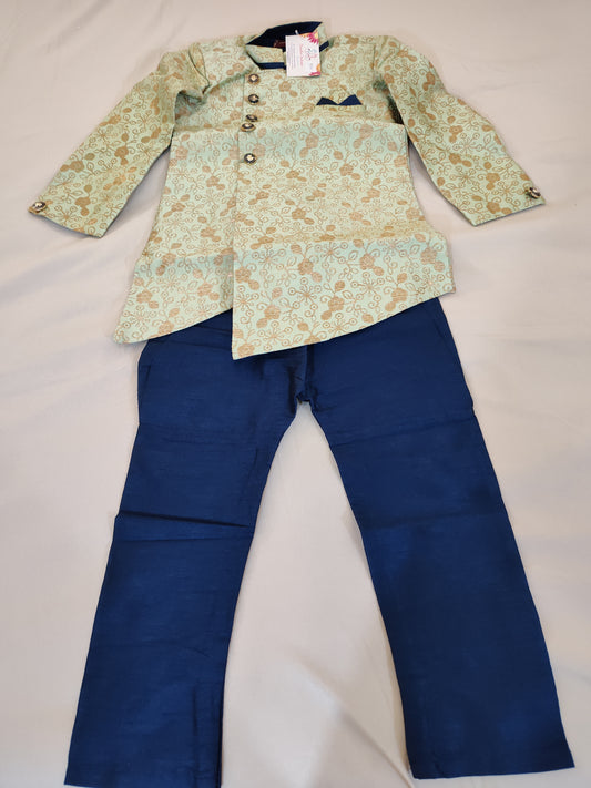 Appealing Light Green Color Kids Party Wear Sherwani And Pajama Pant