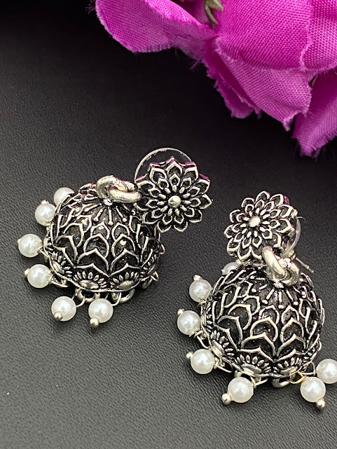 Fabulous Oxidized Silver Flower Motif Jhumkas With Pearl Hangings