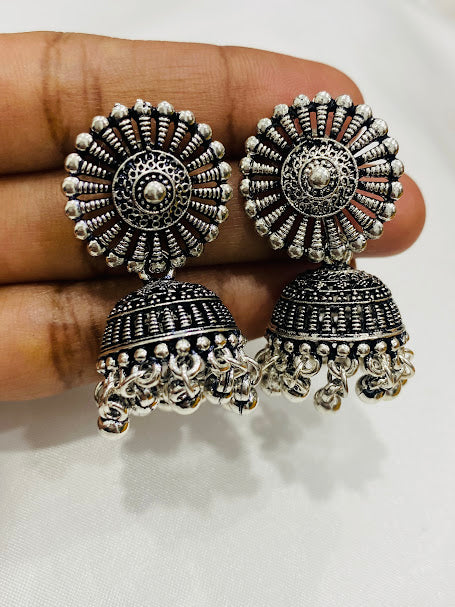 Appealing Oxidized Silver Color Flower Designer With Beads Jhumka Earrings