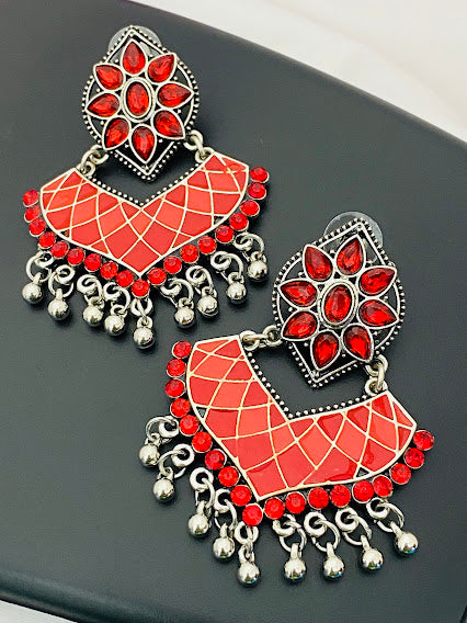 Alluring Red And Gold Oxidized Designer Earrings With Jhumka
