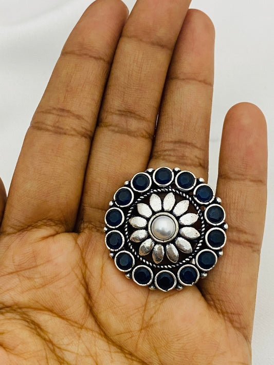 Trendy Blue Stone Beaded Flower Designed Silver Toned Oxidized Finger Ring