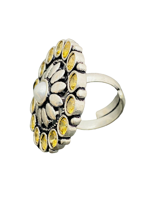 Attractive Yellow Stone Beaded Floral Designed Oxidized Pearl Finger ring