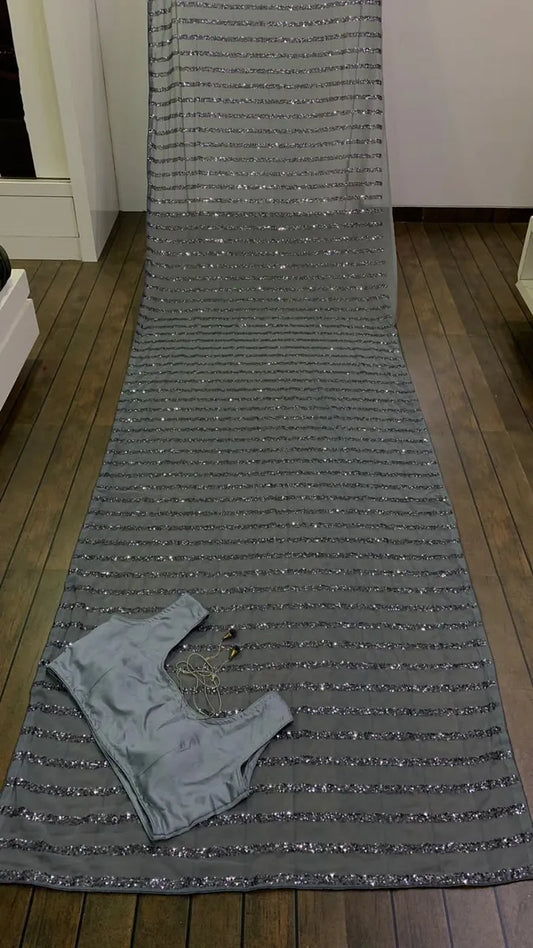 Japan Satin Plain Light Gray Fancy Saree With Sequins Satin Blouse
