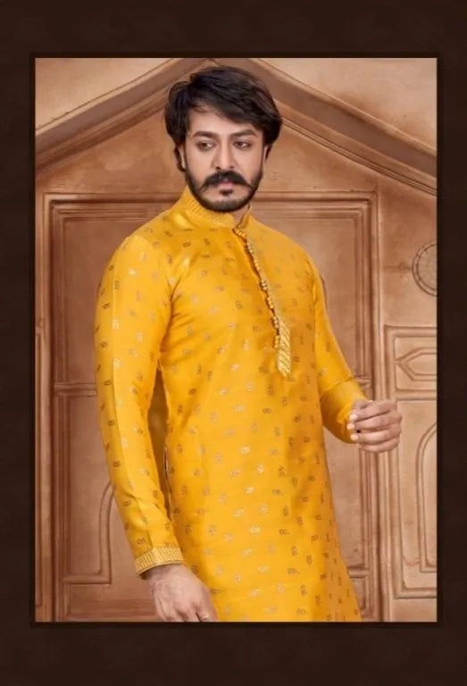 Men's Pure Jacquard Leaf Work Kurta Pajama Set In Yellow