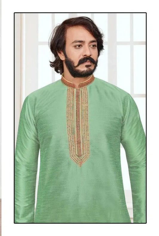 Royal Men's Embroidered Pure Silk Kurta Pajama Set - Light Green