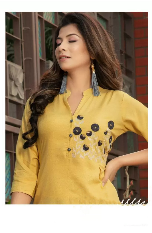 Gorgeous Yellow Slub Rayon Kurti With Matching Gray Palazzo Pants