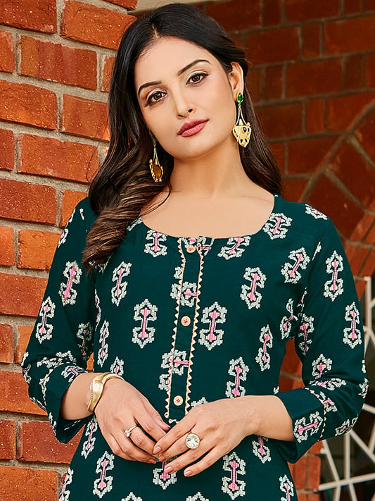 Gorgeous Dark Green Rayon Flex Printed Kurti With Pink Palazzo Pants