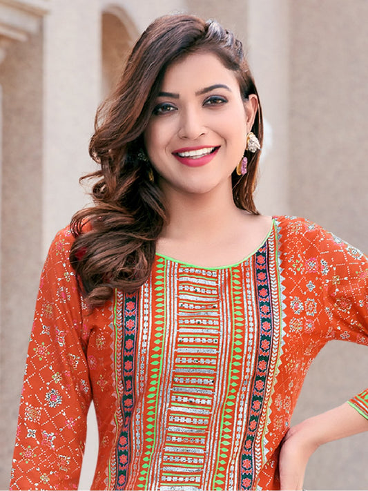 Appealing Orange Color Printed Kurti With Green Palazzo Pants