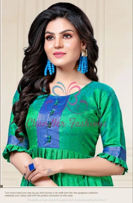 Emerald Green Color Aura Silk Kurti With Blue Border