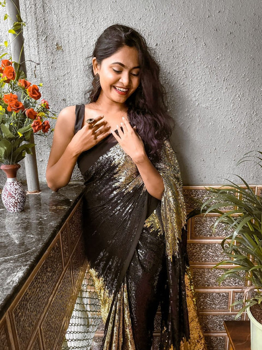 Shining Double Shade Beautiful Yellow And Black Sequins Work Saree