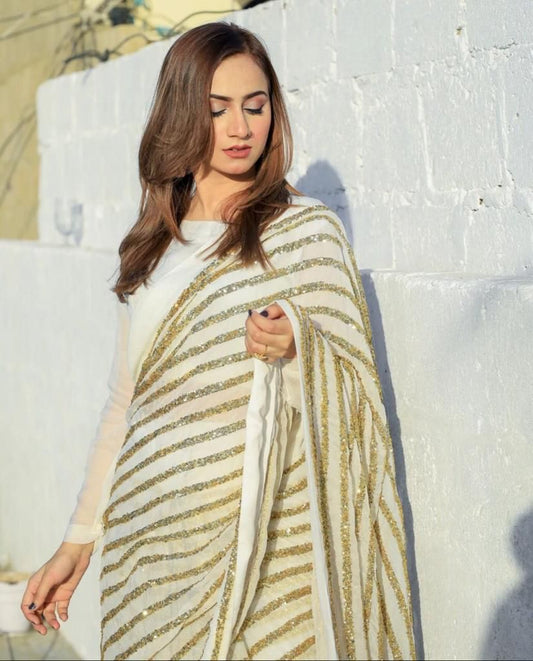 Latest Party Wear Sequins Stripe Pure Georgette Trendy Saree