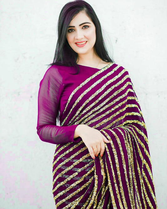 Elegant Purple Sequins Stripe Pure Georgette Trendy Saree