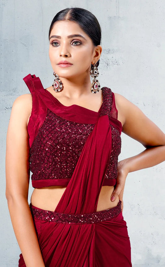 Stylish Dark Maroon Ready To Wear Lycra Designer Saree