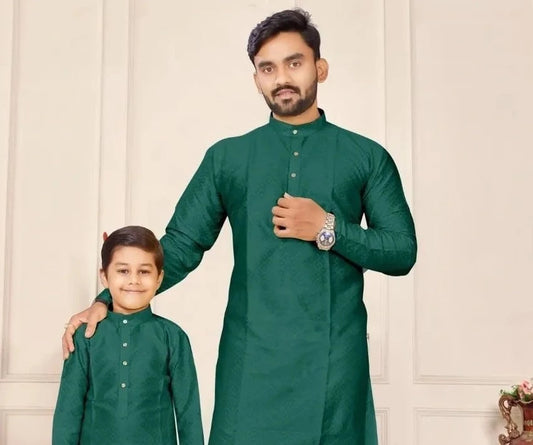 Dad And Son Pure Cotton Silk Regular Pajama Set With Jacket - Sea Green