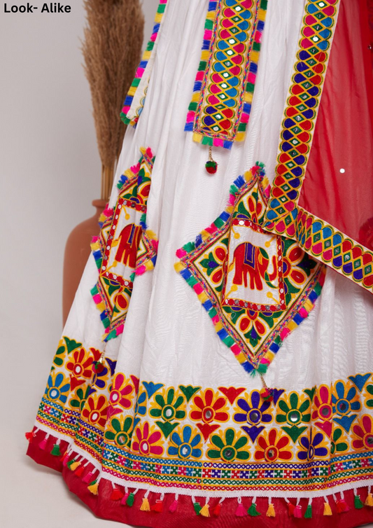 Charming White Colored Embroidery And Mirror Work Lehenga Choli And Dupatta For Women