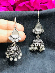 Alluring Oxidized Grey Color Drop Stone Hook Earrings With Pearl Beads