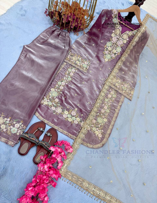 Pretty Lavender Color Pure Chinon Silk With Heavy Embroidery Work Palazzo Suits