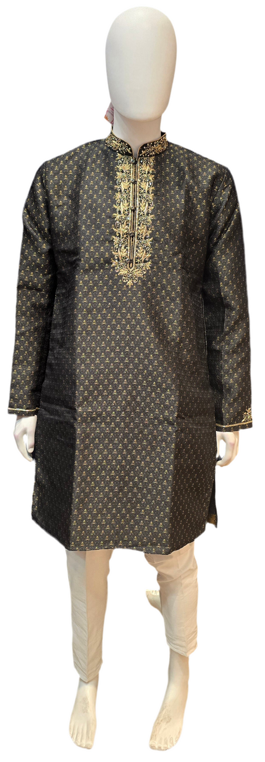 Amazing Black Color Brocade With Pure Zardozi Hand Work Kurta And Pajama Pants For Men