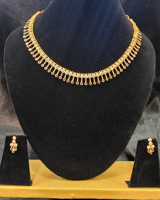 Alluring Dark Pink Color And White Stone Gold Plated Necklace With Earrings Set