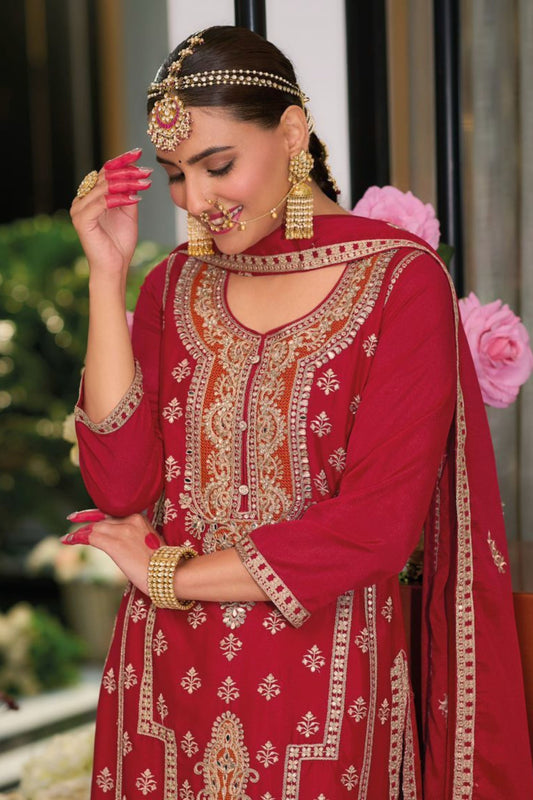 Alluring Designer Red Color Palazzo Suits With Dupatta For Women