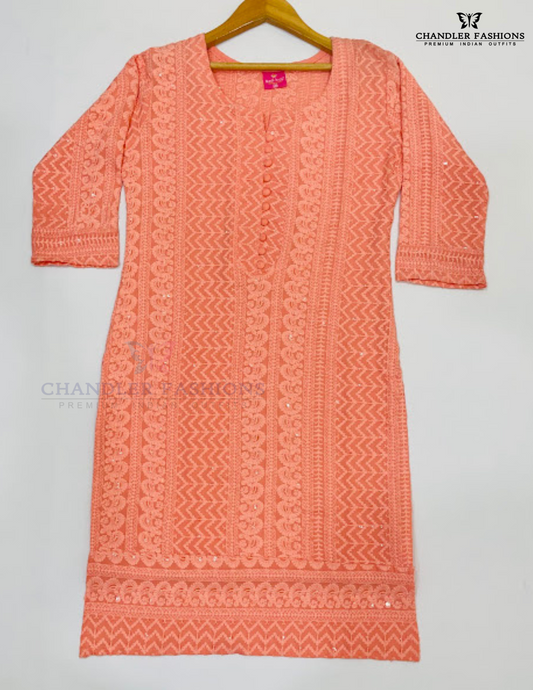 Attractive Peach Color Soft Cotton With Chikankari Work Kurti For Girls